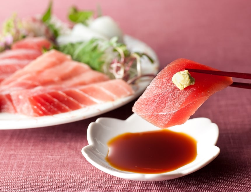 将芥末放置于生鱼片上。如果芥末在酱油中溶解,会破坏其风味。将芥末放在生鱼片上面,可以凸显生鱼片的美味和酱油的鲜味。